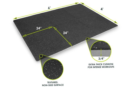 Create a comfortable, cushioned fitness area with The ProsourceFit Rubber Top Exercise Puzzle Mat ¾ inch. Cover 24 or 48 square feet of ground in your gym, garage, basement, or playroom. The dual layer design of rubber and EVA foam create the perfect balance between comfort and support. The speckled rubber top is a non-slip, water-resistant surface so there’s no worry about slipping during your exercises. The ¾-inch high-density EVA foam bottom layer provides strong support and absorbs impacts during high-intensity workouts. The exercise tiles withstand heavy equipment and protect your floors from scratches and scuff. The jigsaw edges make assembly a breeze and securely interlocks each exercise tile. For a polished look, connect the border pieces for clean edges.