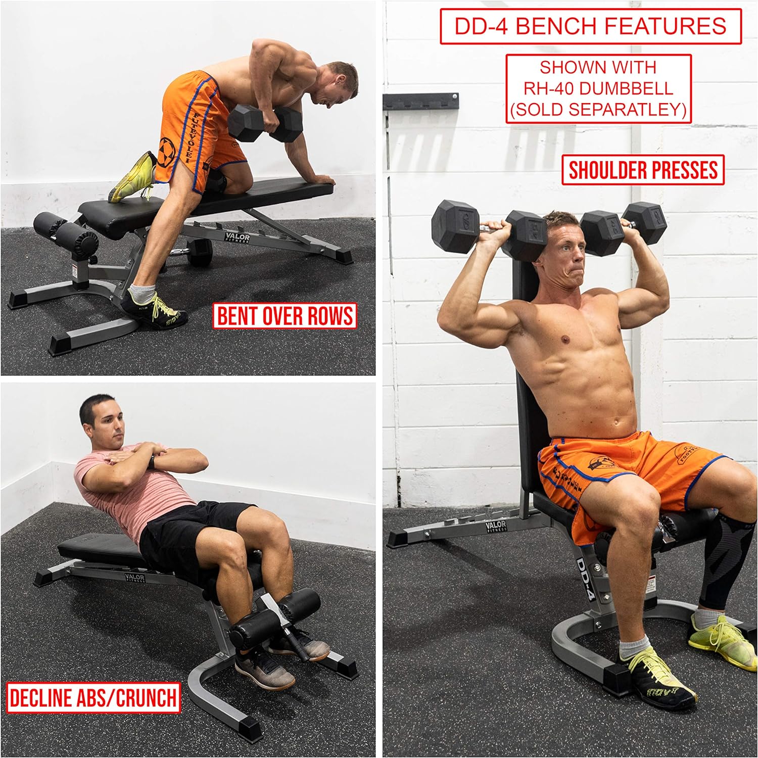 Versatile: Adjustable decline incline bench for exercises: dips, triceps extensions, hip thrusts, bench, shoulder & chest presses, back foot elevated lunge, dumbbell rows.